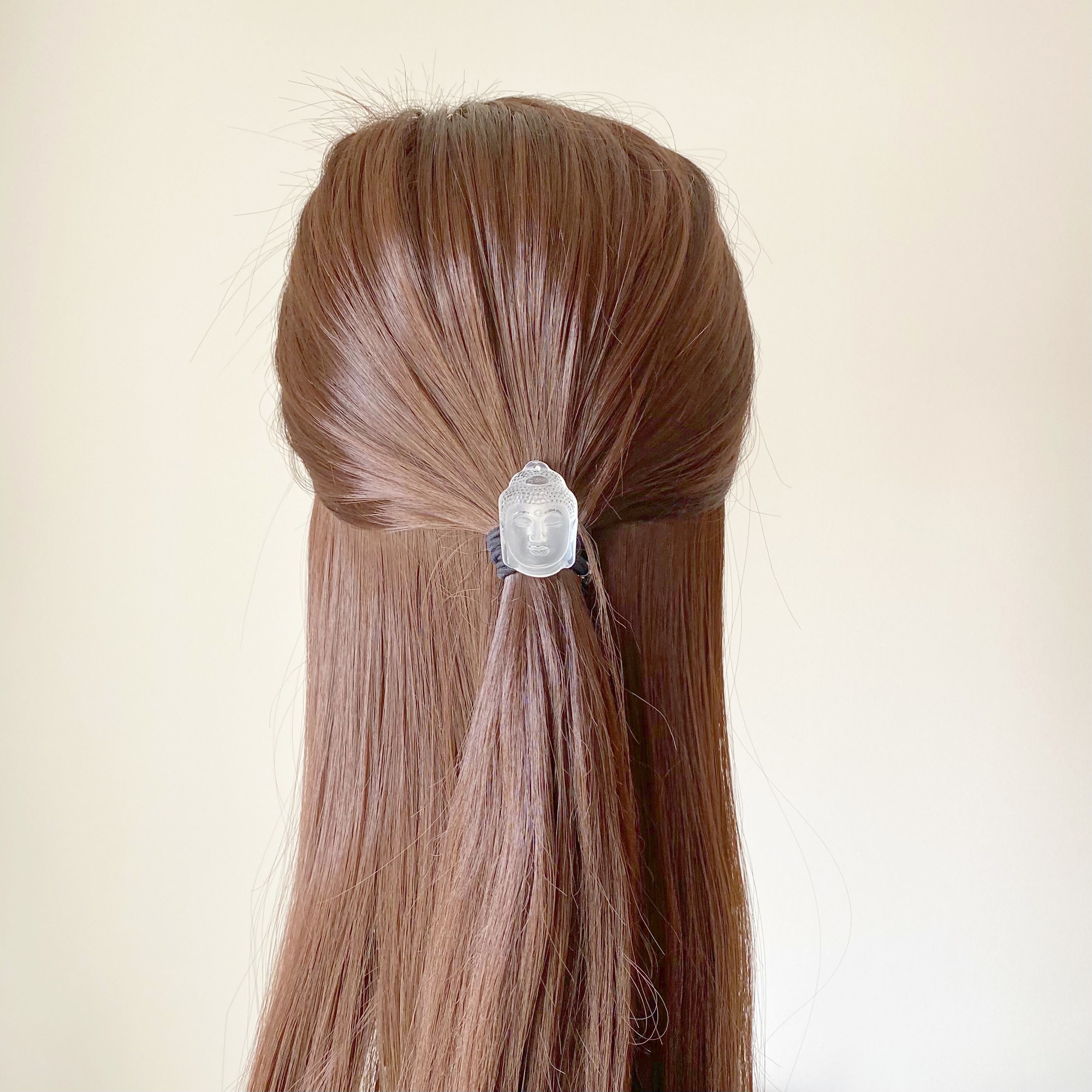 ◆ 不純物のない5A級の上質な水晶に、大仏様のご尊顔をハンドメイドで1点1点彫刻された天然石をヘアゴムに加工しました。